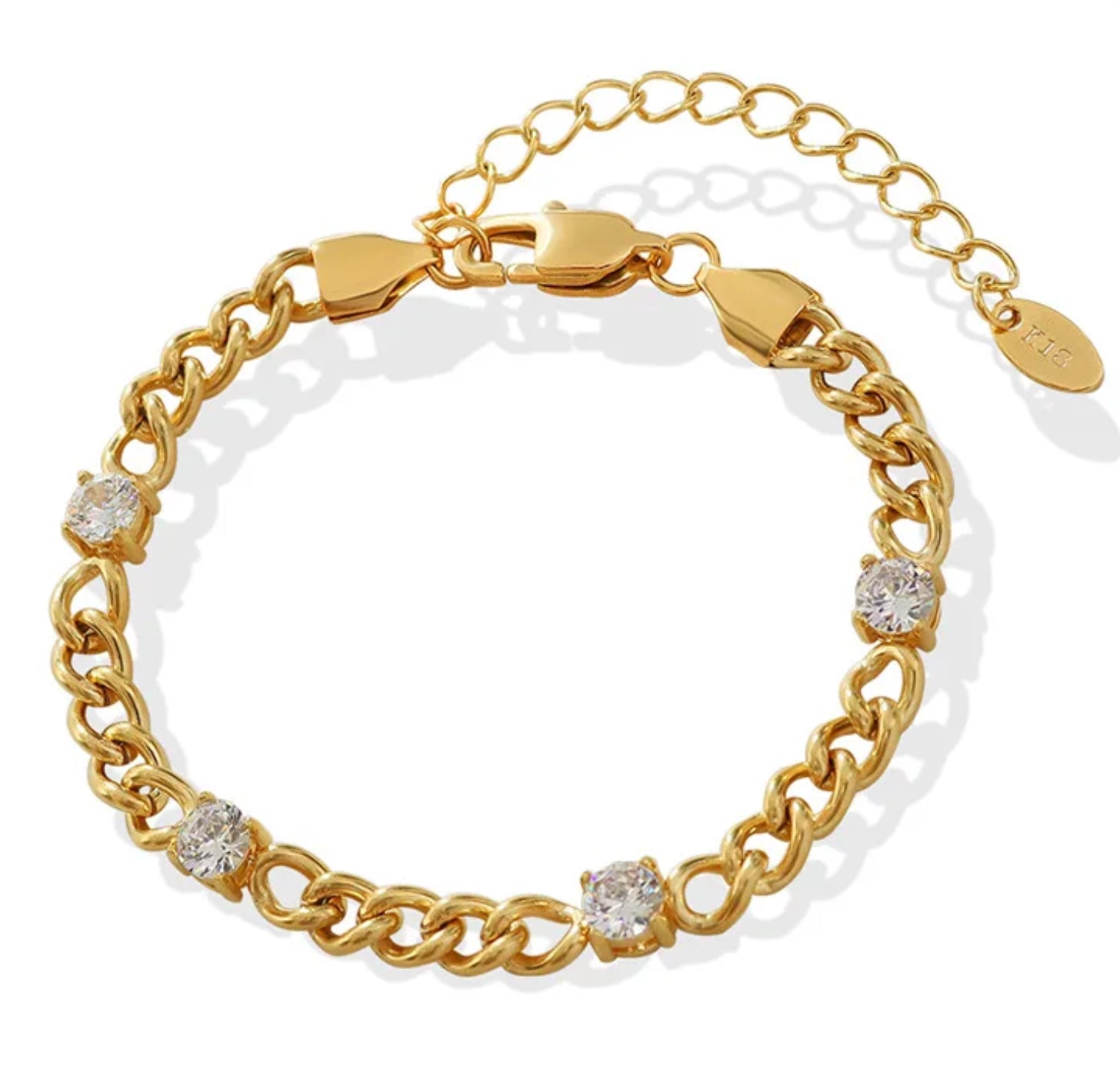 Elevate your style with the Starlight Radiant Bracelet. Crafted in 18K Gold plated, this bold and timeless design features a classic Cuban link chain adorned with exquisite gemstone accents, adding a vibrant touch of luxury to its striking silhouette.