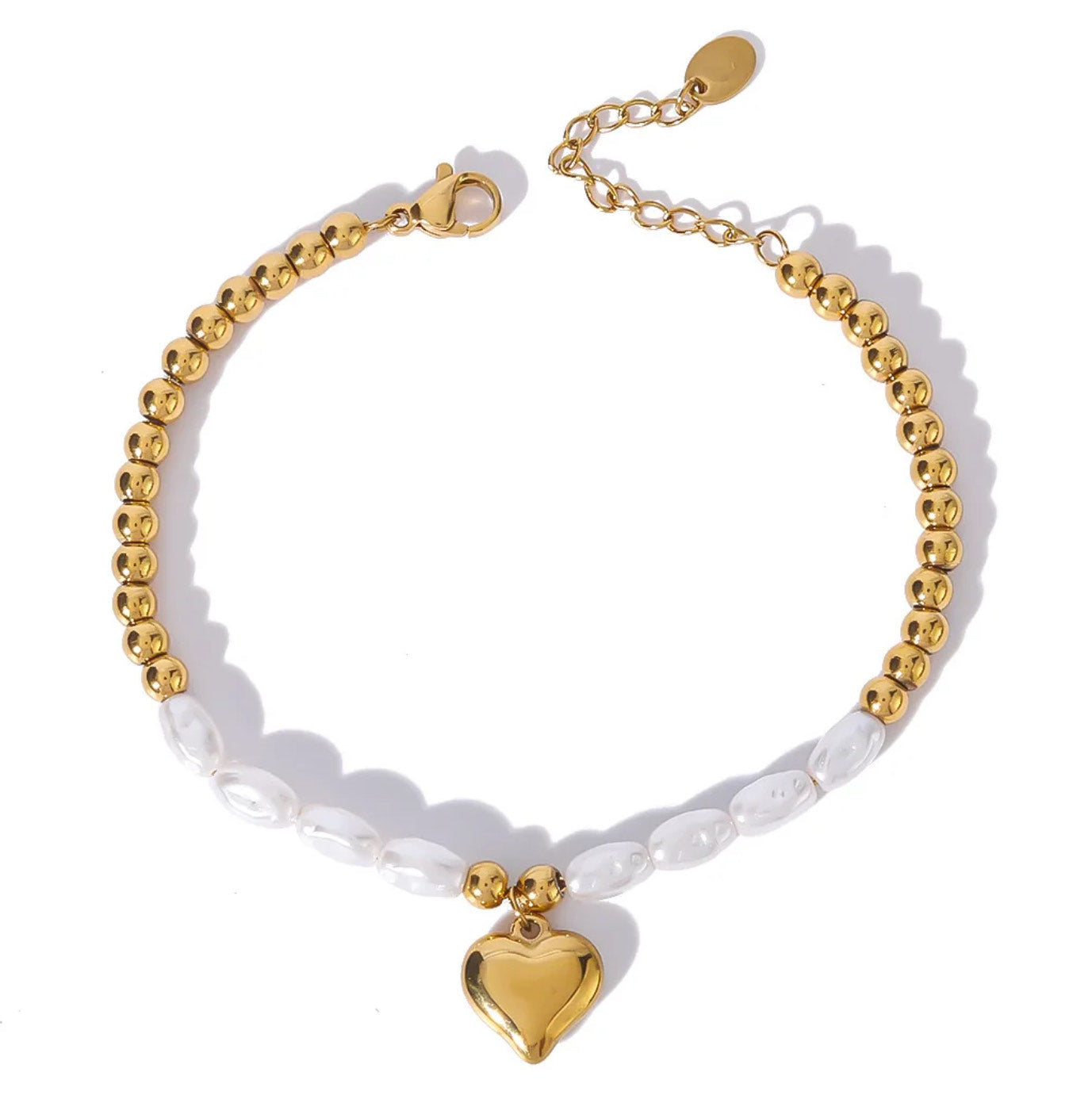 Elevate your elegance with the 18K Gold plated Aurora Grace Bracelet beads heart charm. This timeless accessory features lustrous pearls, intricate beads, and a delicate heart charm, symbolizing love and grace. Perfect for both special occasions and everyday sophistication, the Aurora Grace Bracelet adds a touch of luxury to any look.
